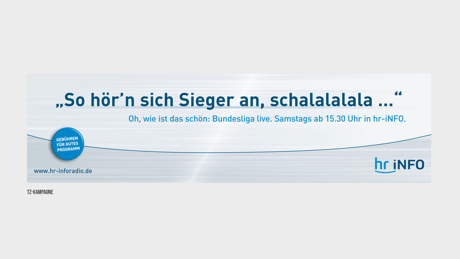 Das Informationsradio des Hessischen Rundfunks überzeugt durch 100% Wortanteil. Die von LL entwickelte Kampagne bringt die Benefits des Senders durch eine Textkampagne ebenso pointiert auf den Punkt: Bilder durch Worte geschaffen. Die Kampagne agiert medienneutral. Plakat als Hauptmedium wird unterstützt durch TZ, Online und Ambient. Ergebnis: hr-iNFO kann seinen Marktanteil kontinuierlich ausbauen.